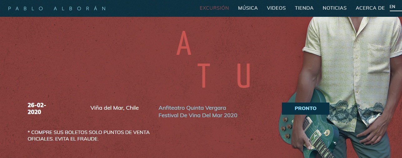 A través de su página web www.pabloalboran.es, se puede apreciar que aparece consignada su actuación para el 26 de febrero. Es decir, para la cuarta noche del Festival de Viña del Mar 2020.