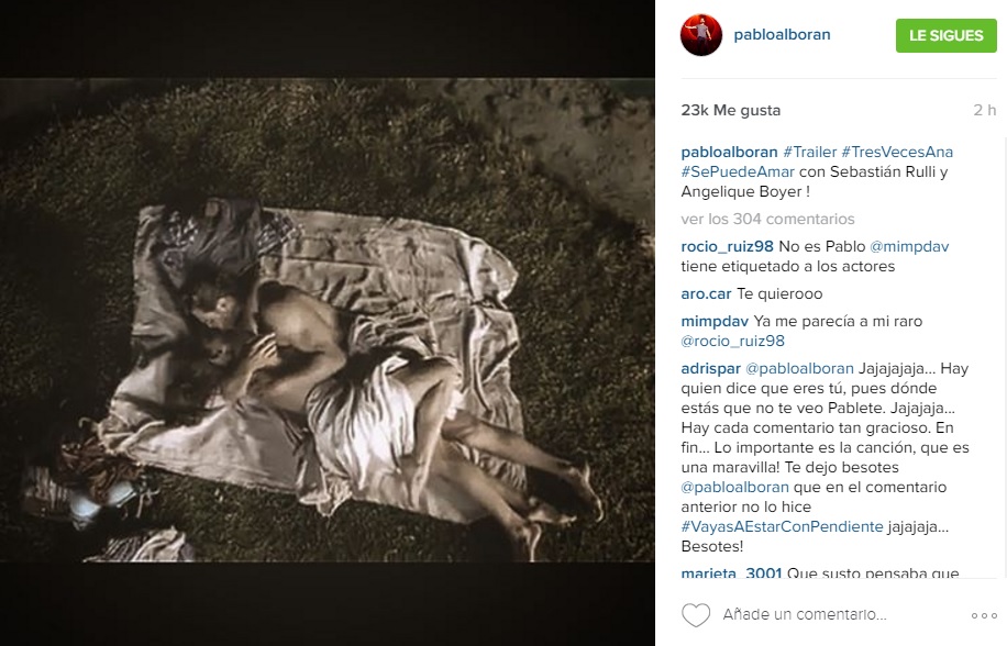 De inmediato, la imagen, que es parte del trailer de la teleserie "Tres veces Ana", donde el malagueño interpreta la canción principal llamada "Se puede amar", superó los 9 mil Me gusta y alcanzó cientos de comentarios, donde se especulaba si el chico en cuestión era o no Pablo.