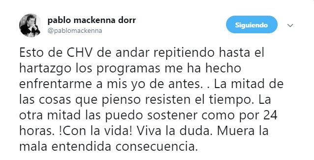 Y es que a través de su cuenta de Twitter, el escritor señaló que las repeticiones lo han hecho enfrentarse a sus 'yo de antes'; pues, mientras la mitad de las cosas que piensa resisten en el tiempo, la otra mitad no se sostiene ni por 24 horas.
