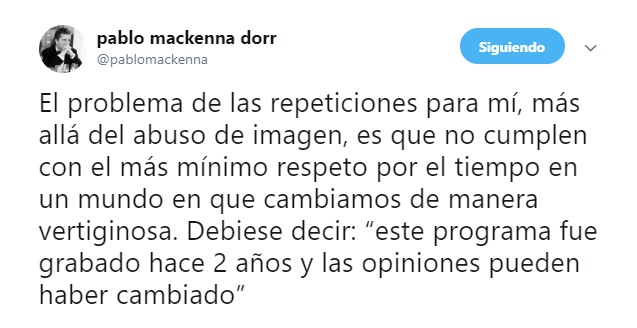 Además, agregó que la repetición del espacio debiese decir 'este programa fue grabado hace dos años y las opiniones pueden haber cambiado'.