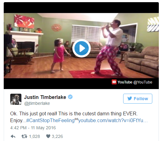 Josh Rinder es estadounidense y constantemente sube a su canal de Youtube las coreografías que realiza junto a su hija cuando la mamá no está. Esta vez, bailaron al ritmo de la nueva canción de Justin Timberlake "Can’t stop the feeling" y fueron tantos los comentarios que surgieron en redes sociales sobre este baile y tierno momento, que el mismo cantante lo compartió en su cuenta de Twitter.