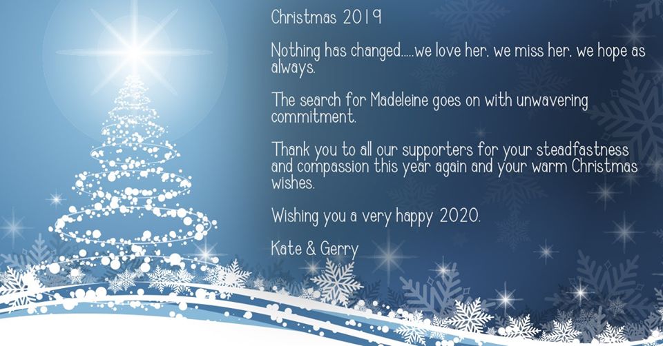 "La búsqueda de Madelaine sigue con un compromiso inquebrantable. Gracias a todos nuestros seguidores por su constancia y compasión este año de nuevo y sus cálidos deseos de navidad. Te deseo un muy feliz 2020", se puede leer también en la publicación de Kate y Garry McCann.
