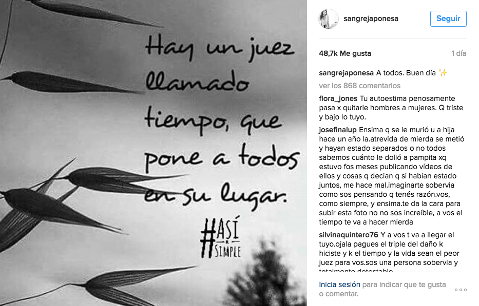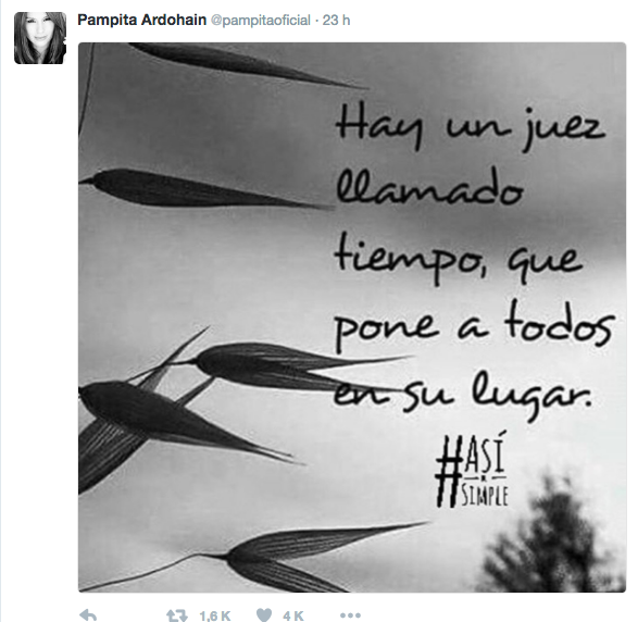Más tarde la actriz y cantante subió una foto a Instagram en donde se lee que "hay un juez llamado tiempo, que pone a todos en su lugar". Y Pampita usó esa misma frase y la publicó en Twitter.