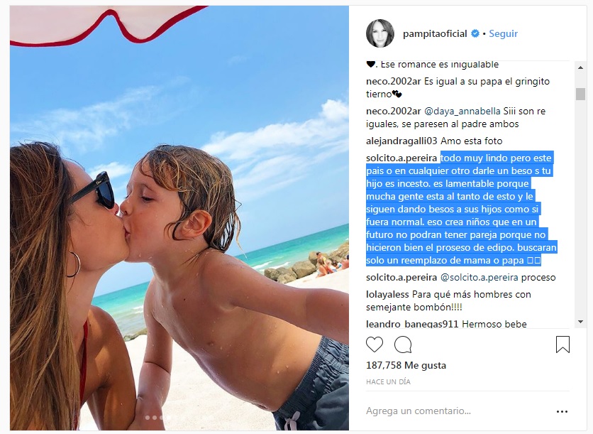 “Todo muy lindo pero este país o en cualquier otro darle un beso a tu hijo es incesto. Es lamentable porque mucha gente está al tanto de esto y les siguen dando besos a sus hijos como si fuera normal. Eso crea niños que en un futuro no podrán tener pareja porque no hicieron bien el proceso de Edipo. Buscaran solo un reemplazo de mamá o papá”, escribió una usuaria, generando gran molestia entre los comentarios.