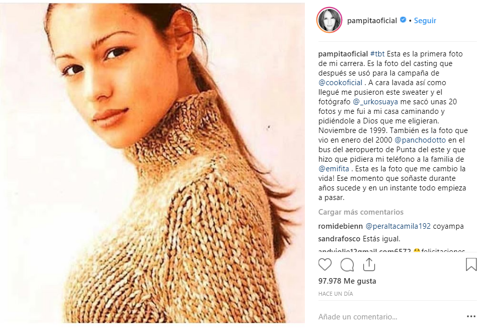 Fue a través de Instagram, que Pampita compartió la foto que la llevó a la fama. "Esta es la primera foto de mi carrera (...) A cara lavada así como llegué me pusieron este sweater y el fotógrafo @_urkosuaya me sacó unas 20 fotos y me fui a mi casa caminando y pidiéndole a Dios que me eligieran", escribió en la descripción.
