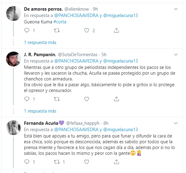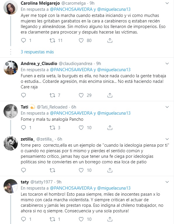 Mi solidaridad con mi amigo @miguelacuna13 y su camarógrafo en terreno. “ Elllaaaa , Aquí viene, la que tira Gas Pimienta y corre como rata,La que acusa a un gran periodista, serio y consecuente de hacer su trabajo, la displicente con los trabajadores de las comunicaciones. pic.twitter.com/RSpCm49hRa