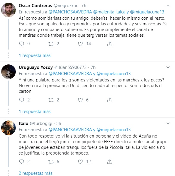 El hecho fue altamente comentado en Twitter, donde habían opiniones divididas. Si bien algunos condenaron la agresividad hacia el equipo de Canal 13, otros cibernautas fueron más críticos, aludiendo a que esto se debe a la molestia de las personas por la censura de los medios.
