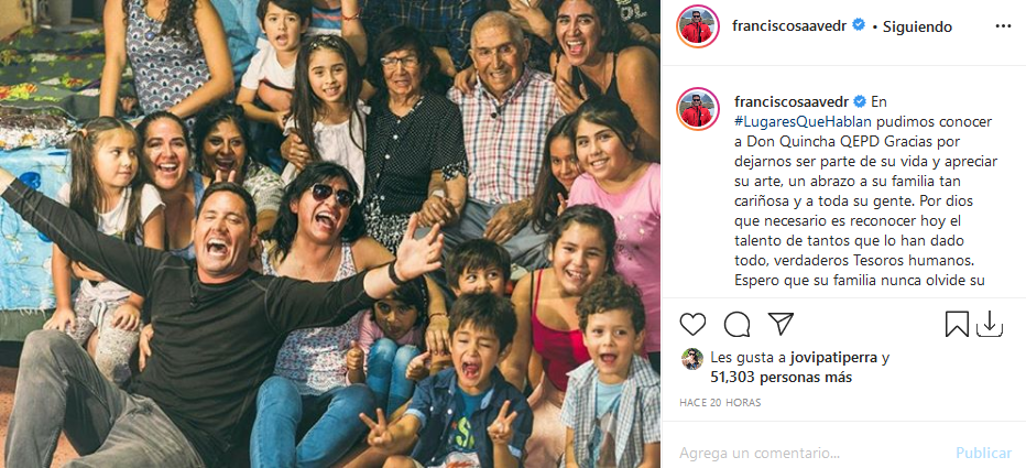 “En #LugaresQueHablan pudimos conocer a Don Quincha QEPD Gracias por dejarnos ser parte de su vida y apreciar su arte, un abrazo a su familia tan cariñosa y a toda su gente”, comenzó escribiendo el también coanimador en "Aquí somos todos".