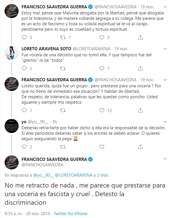Luego de que otro usuario lo instara a decir que hablaba sobre Malucha, Saavedra agregó en su mensaje el nombre de la actriz. En ese contexto, Loreto Aravena también quiso referirse al hecho aclarando que su colega "fue vocera de una decisión que no tomó ella. Y que tampoco fue del ‘gremio’ ni ‘de todos'".