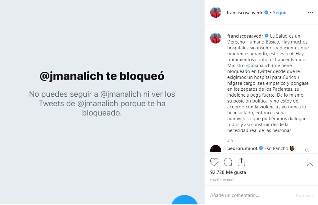 Este jueves el ministro de Salud, Jaime Mañalich, sufrió una funa en el Hospital del Salvador mientras visitaba a manifestantes heridos. En ese contexto, horas después el animador decidió emplazar a la autoridad a través de su cuenta de Instagram, dejando en evidencia que este incluso lo había bloqueado en Twitter.
