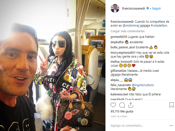 El animador de Canal 13 se topó con ella en uno de los vuelos que realizó. "Cuando tu compañera de avión es Nicky Minaj jajajá. #VidadeFans", escribió junto a la foto, que ya cuenta con más de 95 mil "Me Gusta".