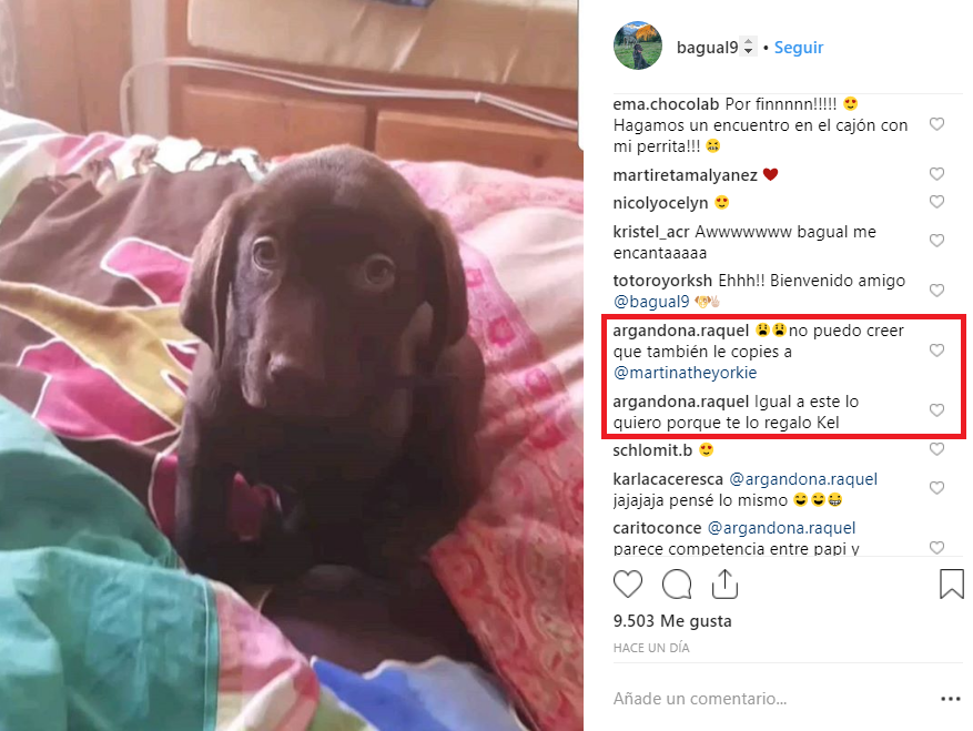 En una de las fotografías de "Bagual", Argandoña escribió "No puedo creer que también le copies a "Martina The Yorkie"" , haciendo alusión a la cuenta de la mascota de Kel Calderón.
