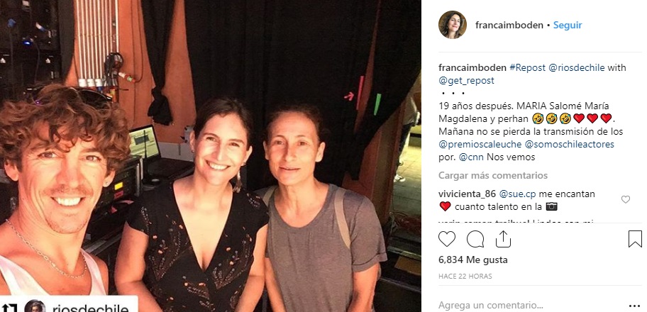 La postal la compartió inicialmente Ríos, e Imboden resposteó su publicación. “19 años después: María Salomé, María Magdalena y Perhan. Mañana no se pierda la transmisión de los Premios Caleuche”, fue lo que escribió la intérprete.
