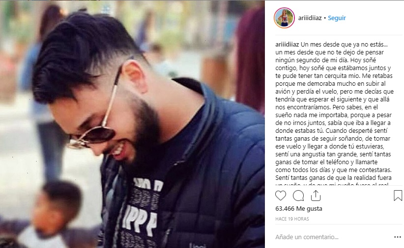 "Un mes desde que ya no estás... un mes desde que no te dejo de pensar ningún segundo de mi día. Hoy soñé contigo, hoy soñé que estábamos juntos y te pude tener tan cerquita mío. Me retabas porque me demoraba mucho en subir al avión y perdía el vuelo, pero me decías que tendría que esperar el siguiente y que allá nos encontraríamos. Pero sabes, en el sueño nada me importaba, porque a pesar de no irnos juntos, sabía que iba a llegar a donde estabas tú".