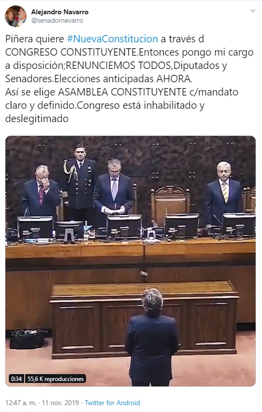 "El Presidente Piñera quiere una Nueva Constitución a través de un Congreso Constituyente; entonces pongo mi cargo a disposición y todos los parlamentarios deben hacer lo mismo. Es la única fórmula", manifestó en Twitter. A la vez aseguró que el Congreso está inhabilitado y deslegitimado para el proceso de Asamblea Constituyente que quiere la ciudadanía.