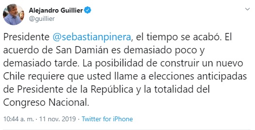 "El tiempo se acabó. El acuerdo de San Damián es demasiado poco y demasiado tarde", partió señalando para luego agregar: "la posibilidad de construir un nuevo Chile requiere que usted llame a elecciones anticipadas de Presidente de la República y la totalidad del Congreso Nacional".
