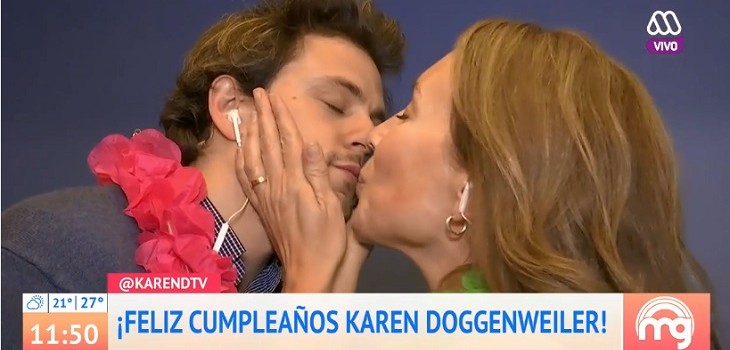 Luego Joaquín quiso imitar al conductor y también pidió un piquito con la cumpleañera. "Para mí ella es una mujer referente de las comunicaciones y siempre soñé con un beso contigo", comentó. Para sorpresa de todos, Karen accedió sin problema a darle un piquito al trasandino.