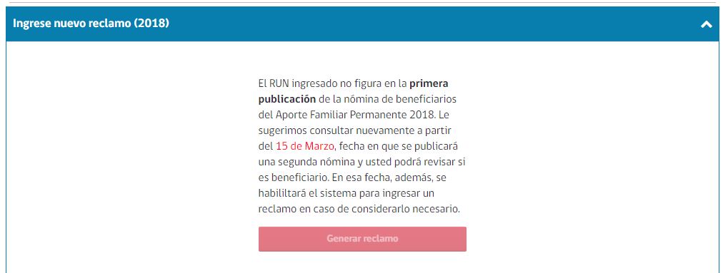 Por ejemplo, si una persona cree cumplir con los requisitos establecidos por ley para el Bono Marzo, pero no aparece como beneficiaria del Aporte, o recibió pago por menos cargas familiares de las que le correspondían, puede realizar un reclamo, el que será gestionado por la entidad administradora de sus cargas familiares.