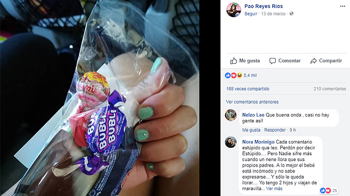 La historia fue relatada en redes sociales por Paola Reyes. "Al momento de abordar se me acercó un señor con una bebé, me obsequió estos dulces, y también a todos los pasajeros alrededor de él, después de leer la tarjeta que traía, me morí de amor", escribió la mexicana en su cuenta de Facebook, junto a tres fotografías de una bolsa que contenía dulces y un tierno mensaje en su interior
