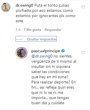 Luego, otro usuario le dejó una dura crítica, con insultos, la que también respondió. "¿No sientes vergüenza de ti mismo al insultar sin ni siquiera saber las condiciones que hay en mi zona? ¿Para realizar deporte? En fin… Así reflejas quien eres, que ni lo sé ni me importa… Que tengas buen día y cuídate", sentenció.