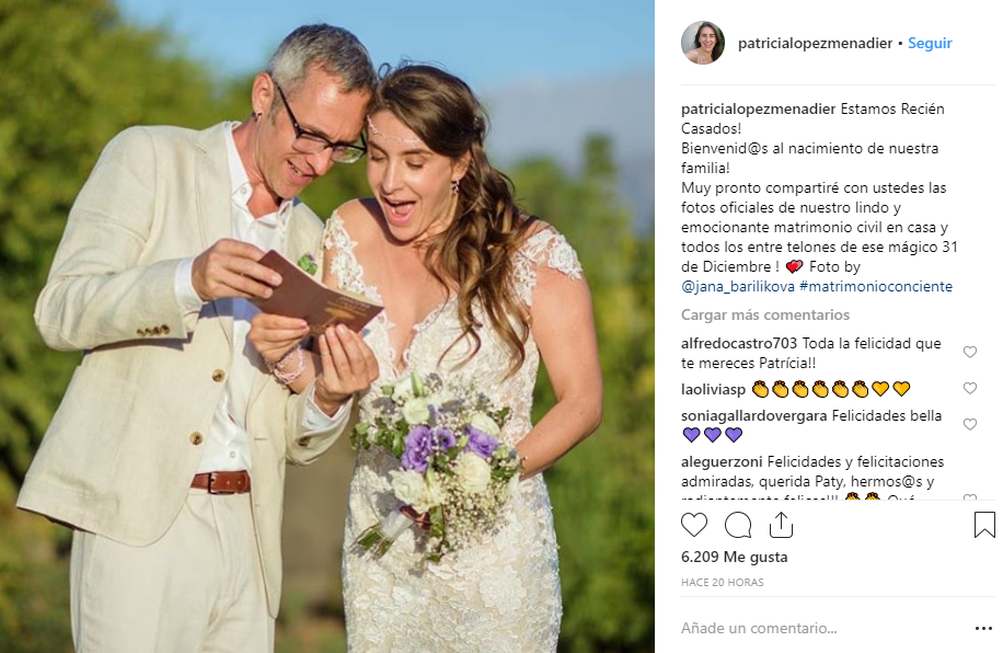 A través de su Instagram, López compartió una tierna imagen, en que aparece junto a su esposo y su vestido de novia. “Estamos Recién Casados!Bienvenid@s al nacimiento de nuestra familia!Muy pronto compartiré con ustedes las fotos oficiales de nuestro lindo y emocionante matrimonio civil en casa y todos los entre telones de ese mágico 31 de Diciembre!”, escribió en la descripción.