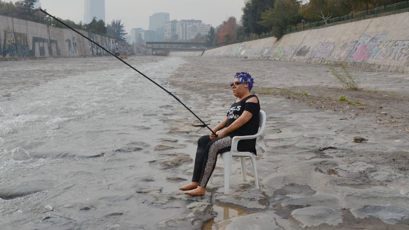 “Forever Vaca’s”, se llama la intervención y que tuvo este lunes a un muñeco que simulaba ser Maldonado pescando en el río Mapocho.