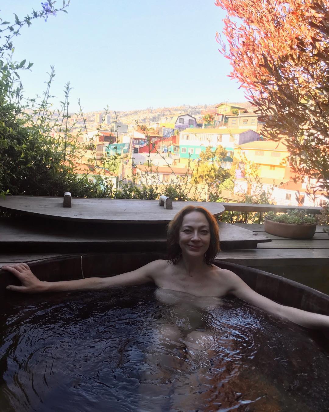 La destacada actriz nacional publicó una fotografía donde posa completamente desnuda mientras disfruta de un baño en una tinaja caliente. Debido al paisaje que la rodea, en el que se pueden ver coloridas casas en un cerro, al parecer Patricia se encontraba de paseo por Valparaíso.