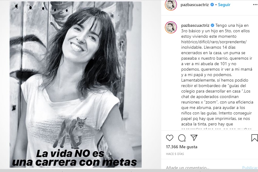 Bascuñán partió diciendo: "Tengo una hija en 3ro básico y un hijo en 5to, con ellos estoy viviendo este momento histórico / difícil / raro / sorprendente / inolvidable. Llevamos 14 días encerrados en la casa, un puma se paseaba por nuestro barrio, queremos ir a ver a mi abuela de 101 y no podemos, queremos ir a ver a mi mamá y a mi papá y no podemos".