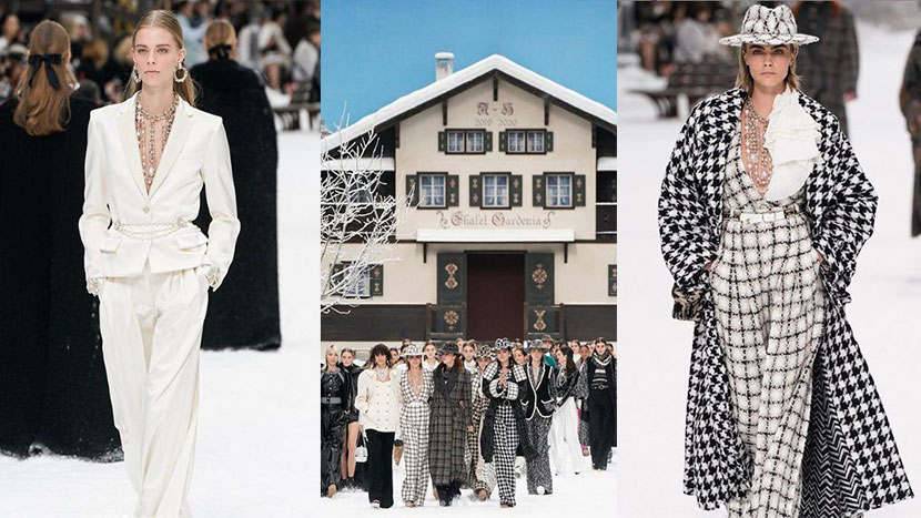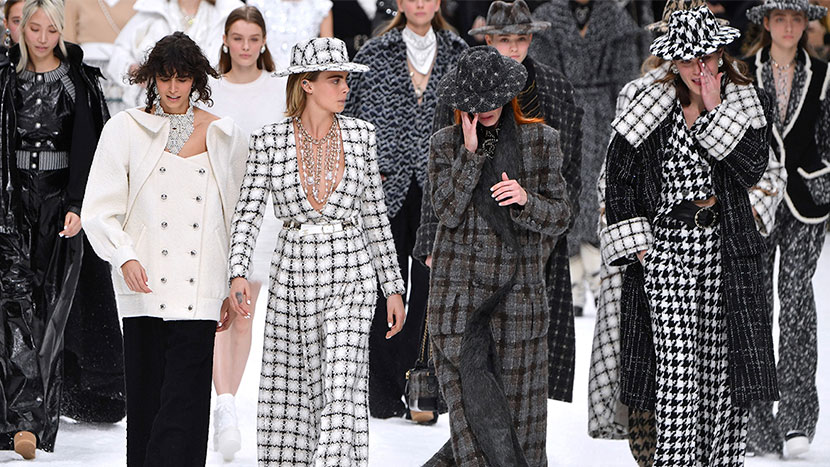 El desfile se realizó sobre una escenografía de nieve, por donde desfilaron las modelos mostrando la propuesta de la firma para la nueva temporada. El clásico traje Chanel reinventado, telas con patas de gallo, colores fuertes contrastados con blanco y negro, además de mucha bisutería marcaron las siluetas.