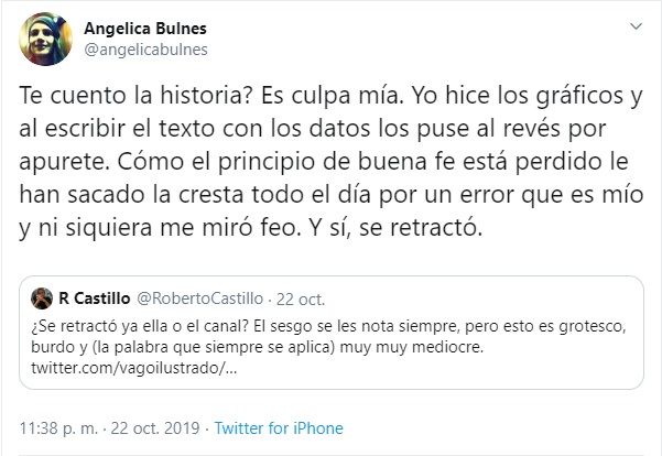 "Te cuento la historia? Es culpa mía. Yo hice los gráficos y al escribir el texto con los datos los puse al revés por apurete. Cómo el principio de buena fe está perdido le han sacado la cresta todo el día por un error que es mío y ni siquiera me miró feo. Y sí, se retractó", escribió en Twitter.