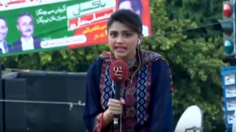 Una periodista del canal 92 de Pakistán se encontraba en un despacho en directo cuando se desmayó y cayó desde la grúa en que se encontraba.