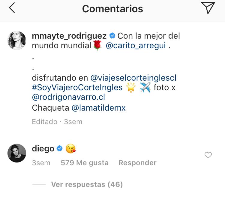 "Me informan que el actor Diego Boneta, quien interpretó a Luis Miguel en Luis Miguel, la serie, anda saliendo con una modelo chilena de 30 años, Mayte Rodríguez, quien es hija de la actriz chilena Carolina Arregui y el director de cine Óscar Rodríguez Gingins", agregó.