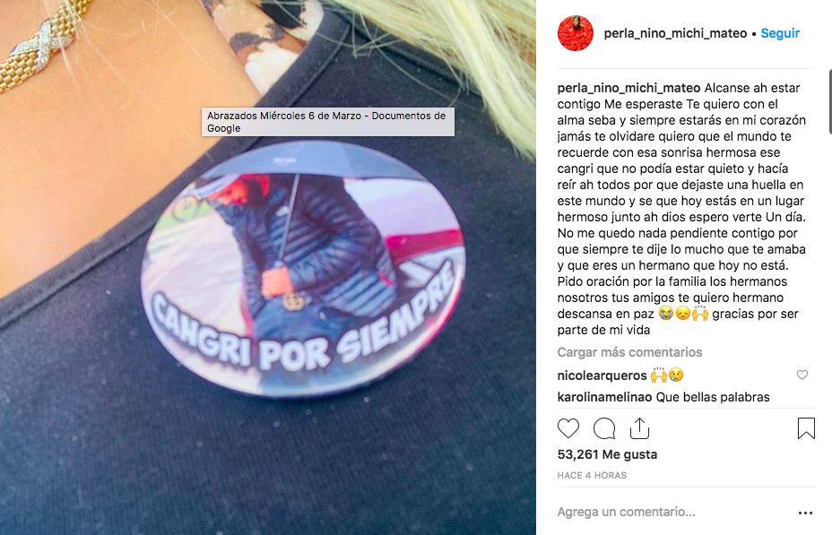“Alcancé a estar contigo, me esperaste. Te quiero con el alma Seba y siempre estarás en mi corazón, jamás te olvidaré, quiero que el mundo te recuerde con esa sonrisa hermosa. Ese Cangri que no podía estar quieto y hacía reír a todos, porque dejaste una huella en este mundo y sé que hoy estás en un lugar hermoso junto a Dios, espero verte un día”, comenzó escribiendo.