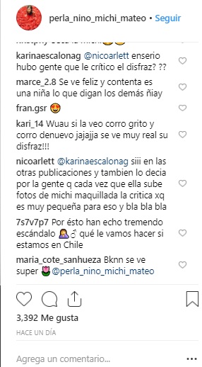 Luego en una segunda publicación dijo que: “Mi hija, para mí siempre va a tener el derecho de opinar y de hacer lo que se le pegue la gana mientras ella sea feliz. Me importa más lo que a ella le guste que lo que los y las demás opinen y tiren mala onda. Es Halloween y los niños tienen que disfrutar y hacer lo que ellos quieran…“.