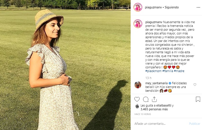 'Nuevamente la vida me premia! Recibo la tremenda noticia de ser mamá por segunda vez, pero ahora dos años mayor, con más aprensiones y miedos propios de la edad. Un par de intentos con mis óvulos congelados que no sirvieron. Pero la naturaleza es sabia y naturalmente llegó a mi vida esta nueva vida, que me hace más power y con más energía para lo que se viene y con el apoyo del mejor compañero!', escribió Pía Guzmán.