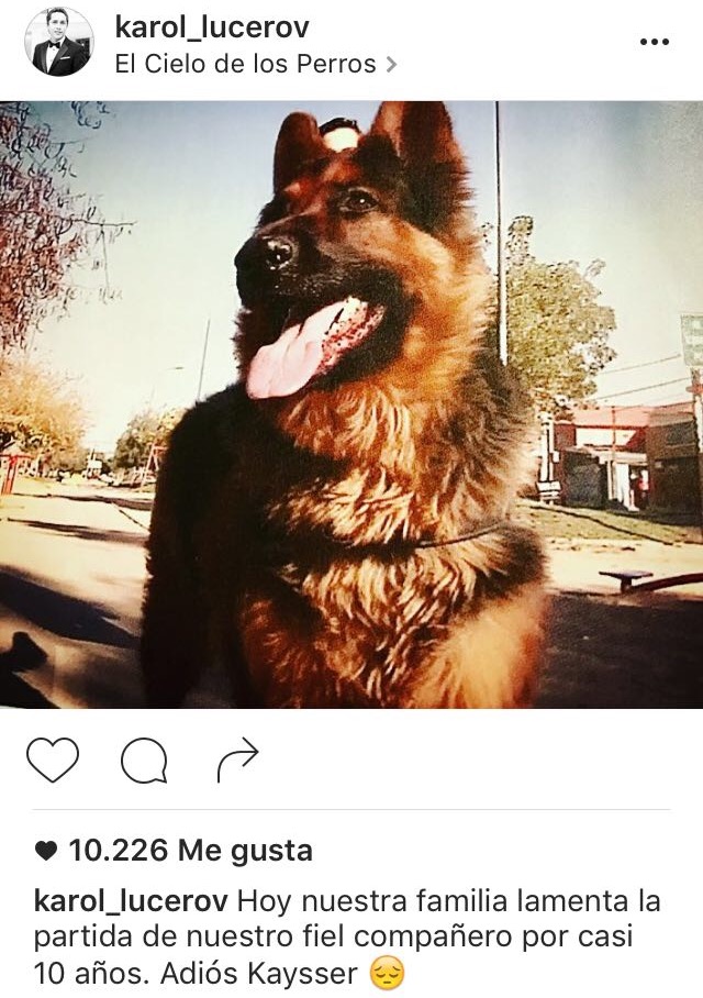 Karol Dance compartió hoy el triste momento que vive junto a su familia debido a la muerte de su perro "Kaysser".
