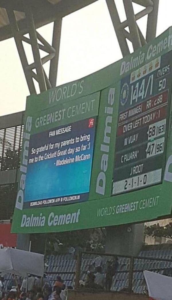 En las pantallas gigantes de los marcadores publicaron durante el entretiempo un supuesto mensaje en Twitter de un fan. "¡Muy agradecida de que mis padres me traigan al juego de cricket! ¡Gran día!", se leía, atribuyéndole el mensaje a la pequeña desaparecida desde 2007.