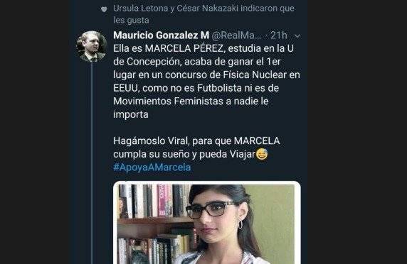 En el tuit, Khalifa era una “científica nuclear” chilena llamada Marcela Pérez y que necesitaba ayuda económica para ir a una crucial conferencia internacional: “Ella es Marcela Pérez, estudia en la U. de Concepción y acaba de ganar el primer lugar en un concurso de Física Nuclear en Estados Unidos. Como no es futbolista ni es de movimientos feministas, a nadie le importa. Hagámosla viral para que Marcela cumpla su sueño y pueda viajar”, se leía en la publicación.