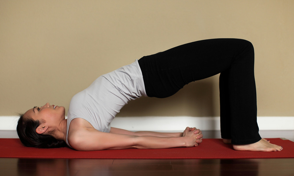 Bandha Sarvangasana. Boca arriba, estira tus brazos al costado de tu cuerpo mientras separas levemente tus piernas; posteriormente, coloca tus talones sobre el piso e impulsa la cadera hacia arriba. Tu torso no debe dejar de tocar el suelo.
