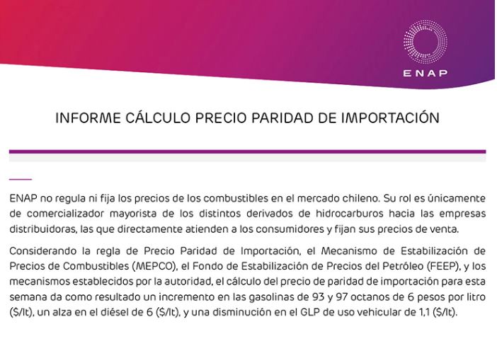 Así lo confirmó este miércoles la Empresa Nacional del Petróleo (ENAP), de acuerdo al último informe semanal de precios mayoristas.