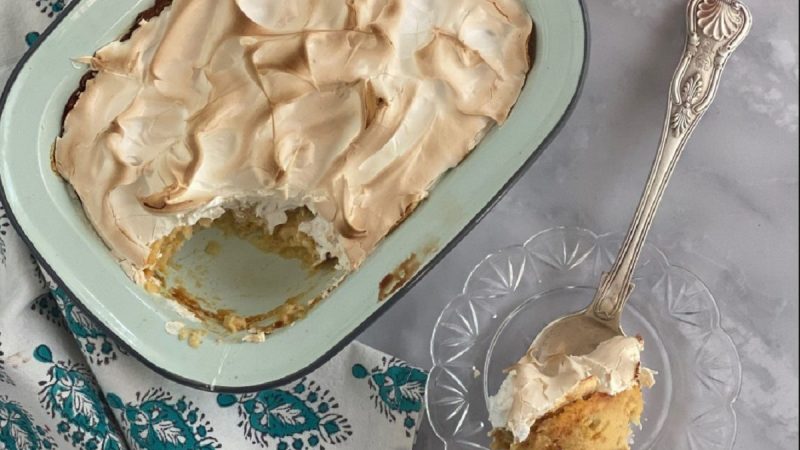 ¿Y el merengue? Pues pone las claras junto al azúcar en un bol y revuelve. Poner el bol a baño maría; el fondo del bol no debe tocar el agua caliente. Calentar revolviendo hasta que el azúcar se haya disuelto; para probarlo debes poner mezcla entre dos dedos y sentir que no hayan gránulos de azúcar. Una vez listo, batir hasta tener un merengue duro y brillante. Poner arriba del postre y dorar con el grill del horno.