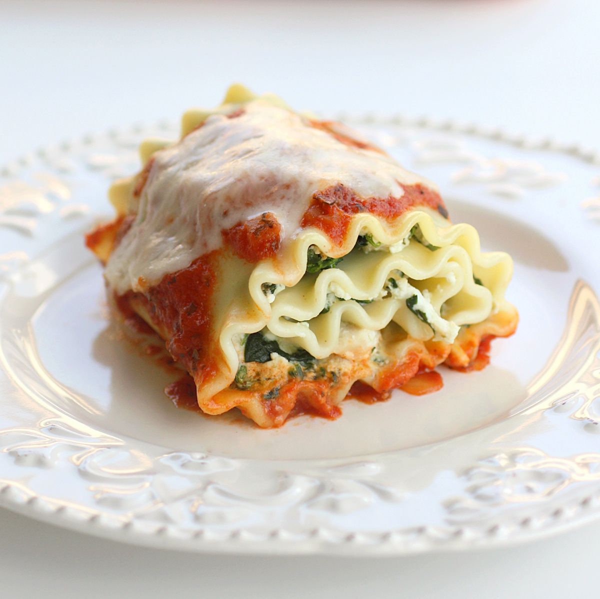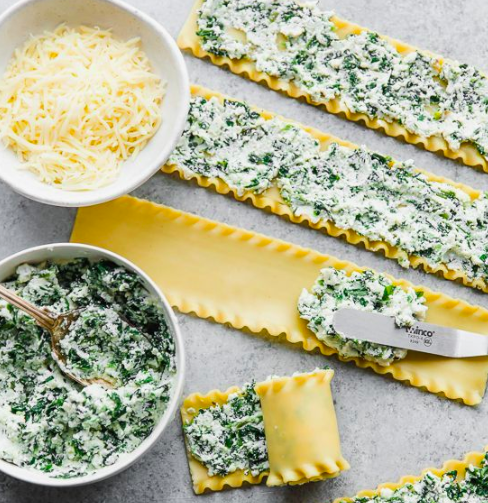 3- Cuando escurras las espinacas, aliñarlas con sal, pimienta, y agregar el queso ricotta a gusto, el huevo, y dos cucharadas de queso parmesao. Escurrir también las lasañas, y estirarlas. Agregar la mezcla de espinaca con ricotta sobre la lámina, y enrollar con la "costura" hacia abajo para que no se abran.