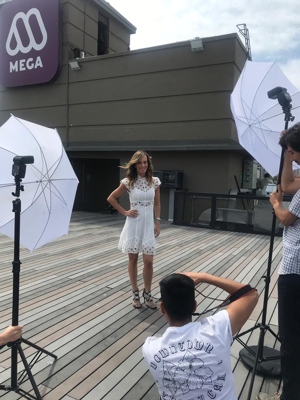 La animadora comenzó su primera jornada laboral con una sesión de fotos para el canal, luego dio entrevistas y se tomó más fotos, esta vez para los medios en general.