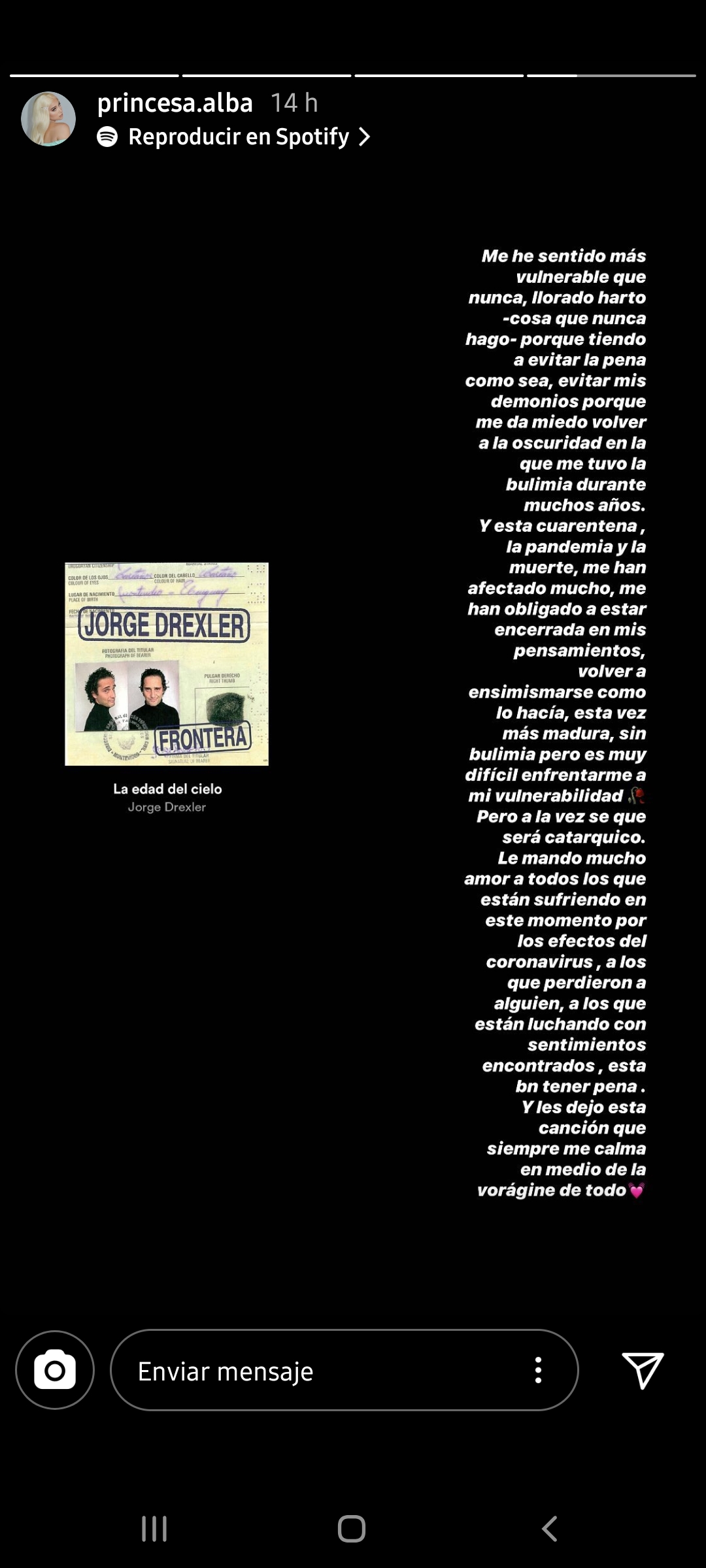 "Les dejo esta canción que siempre me calma en medio de la vorágine de todo", cerró la artista, haciendo referencia al tema "La edad del cielo" de Jorge Drexler.