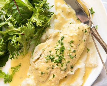 Por otro lado, en una olla añadimos la mantequilla y añadimos la maicena. Mezclamos ambos, evitando que queden grumos y luego, cuando quede en un tono dorado, es el momento de echar el vino blanco con el jugo de limón del otro bowl. Debemos mezclar y revolver hasta que el acohol del vino se evapore y así tener las salsa cremosa. Cuando termina de cocinarse, pasamos la salsa por un colador para que no queden grandes pedazos de rallado de limón. Luego al echarlo al pescado podemos agregarle perejil cortado encima.