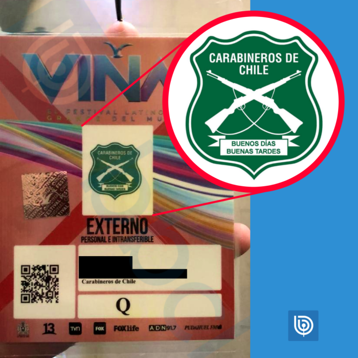 La producción del Festival de Viña 2019 entregó sus credenciales al personal de Carabineros que custodiará el evento. Eso sí, sin darse cuenta de un "pequeño" error. Y es que en el escudo oficial de la institución, que aparece en el documento, se escribió ‘Buenos días, buenas tardes’ en lugar de ‘Orden y Patria’.