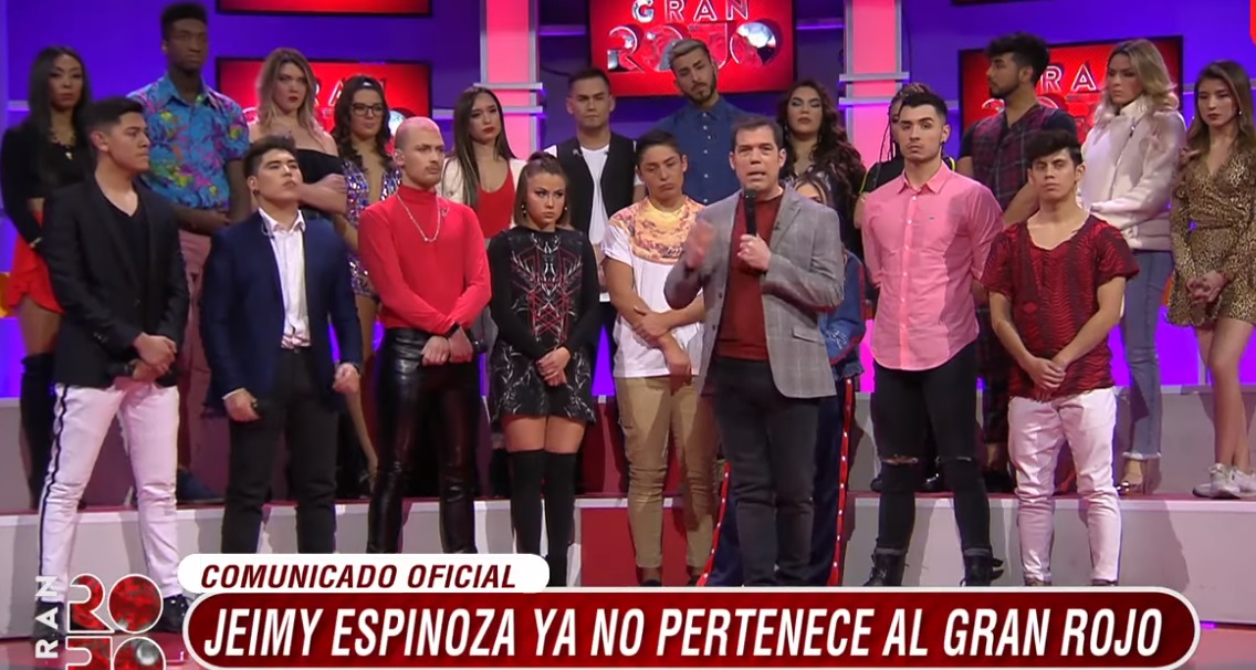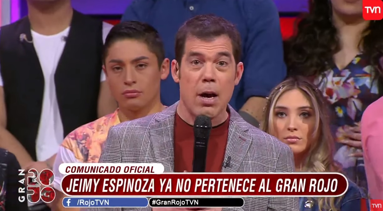 Luego, al comienzo del programa, el 'Tío conductor', Álvaro Escobar, confirmó el anuncio de la joven. "A contar de hoy, a las 15 horas, Jeimy Espinoza ha dejado de pertenecer a la familia Rojo por no cumplir con los estándares de rigor y el compromiso artístico que el programa exige", fue la explicación desde el programa.