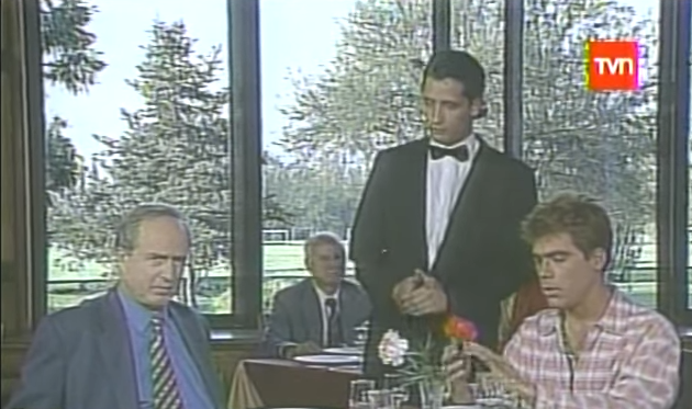 El registro es de una escena protagonizada por Álvaro Escobar, Jaime Vadell y tiene como extra a Juan Pablo Silva, quien interpreta a un mozo de un restaurant.