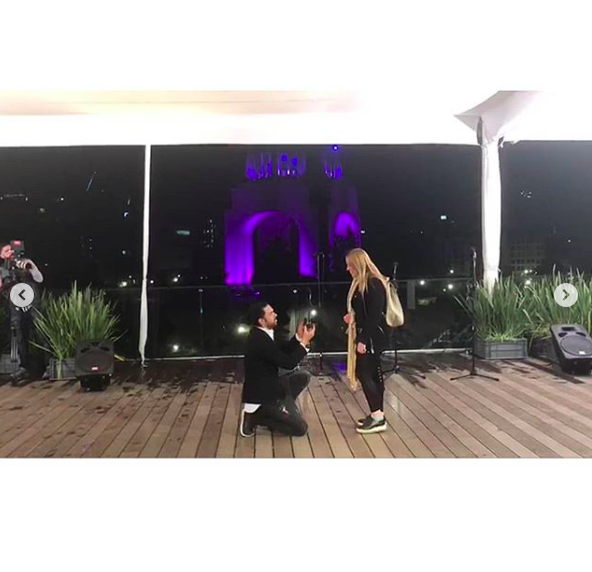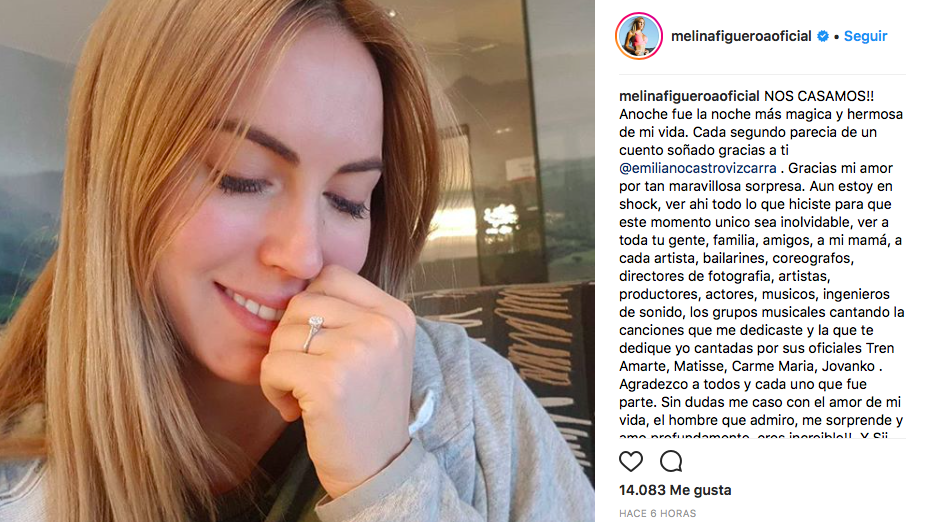 "Gracias mi amor por tan maravillosa sorpresa. Aun estoy en shock, ver ahi todo lo que hiciste para que este momento unico sea inolvidable, ver a toda tu gente, familia, amigos, a mi mamá, a cada artista, bailarines, coreografos, directores de fotografia, artistas, productores, actores, musicos, ingenieros de sonido, los grupos musicales cantando la canciones que me dedicaste y la que te dedique yo", relató Melina en redes sociales, dónde además mostró su anillo de compromiso.