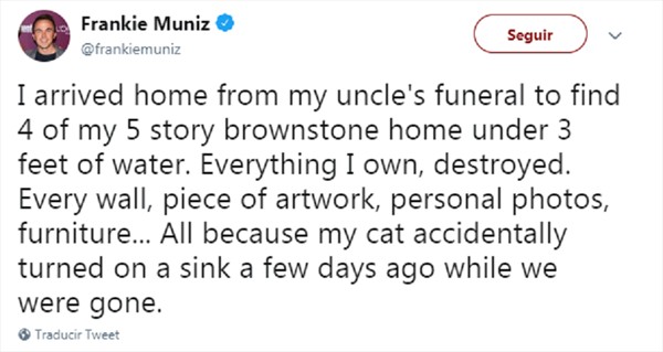 Su gata, Jeri, inundó completamente su casa, destruyendo libros, piezas de arte,ropa y recuerdos del actor. A través de su cuenta de Twitter, Muniz se desahogó.